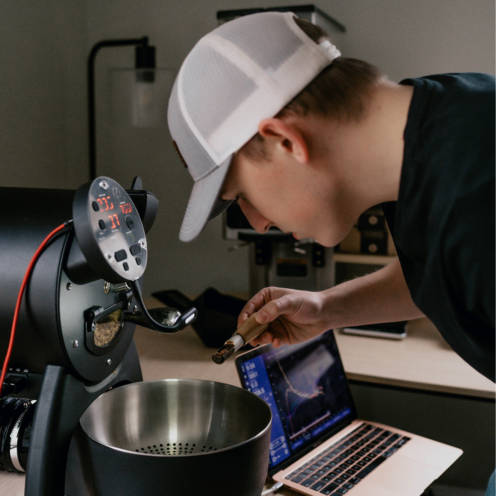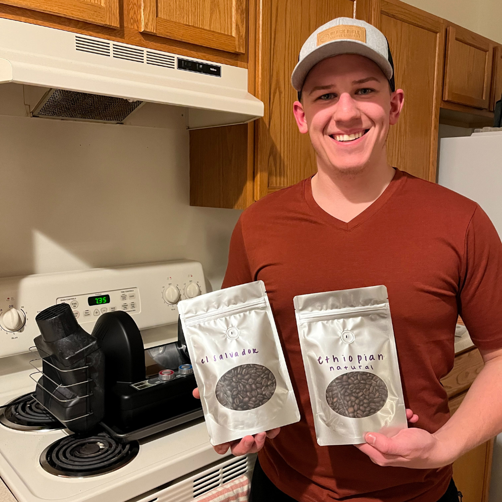 Roasting our first coffees on a tiny home roaster on an old stove.